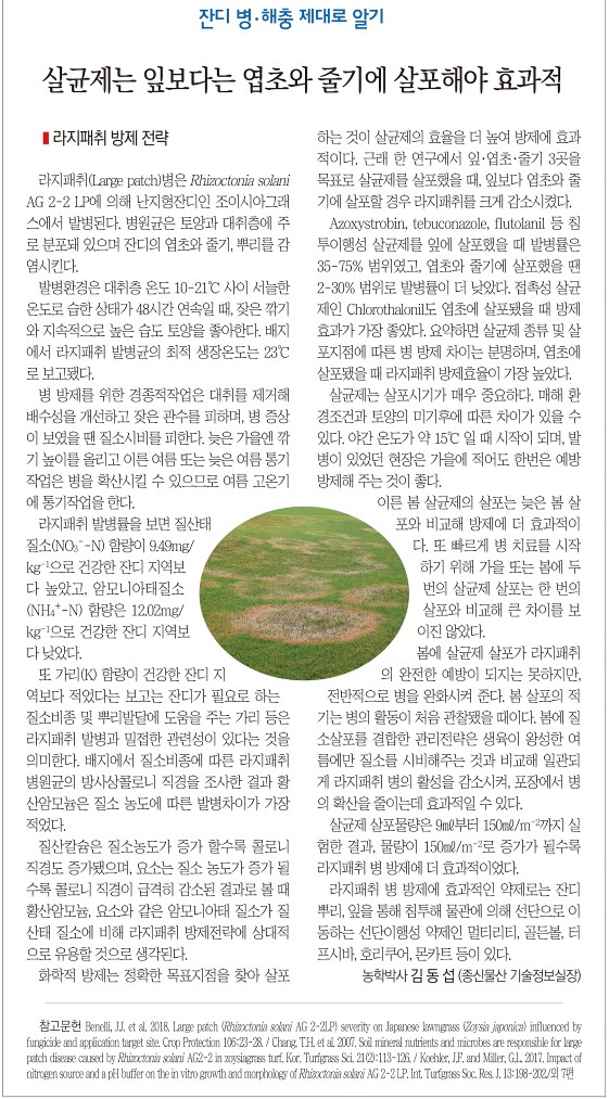 골프산업신문175-5 라지패취 방제 전략 농학박사 김동섭 종신 기술정보실장 페이지 정보 본문 관련링크 http://www.golfin.co.kr/news/articleView.html?idxno=4818 227회 연결 목록
