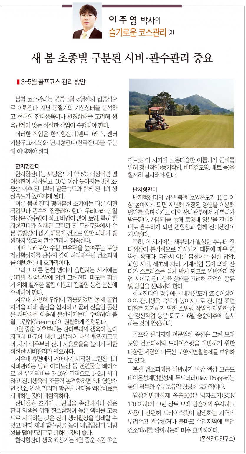 골프산업신문188 새 봄 초종별 구분된 시비,관수관리 중요 농학박사 이주영 종신 기술정보실장 페이지 정보 본문 관련링크 http://www.golfin.co.kr/news/articleView.html?idxno=5171 189회 연결 목록