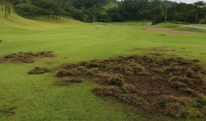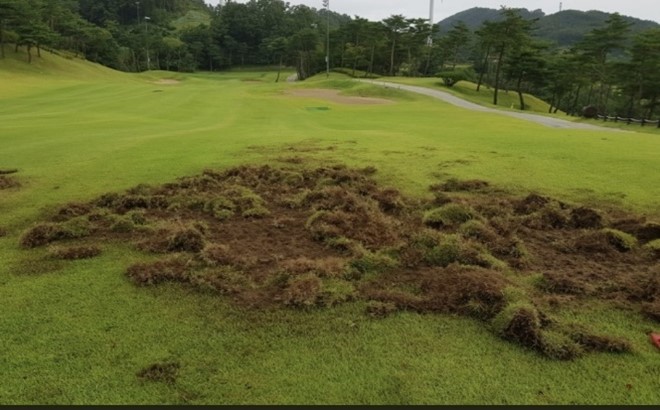 멧돼지 등의 먹이활동으로 인해 굼벵이가 서식하는 페어웨이를 파헤치는 등의 큰 피해를 입고 있는 과정